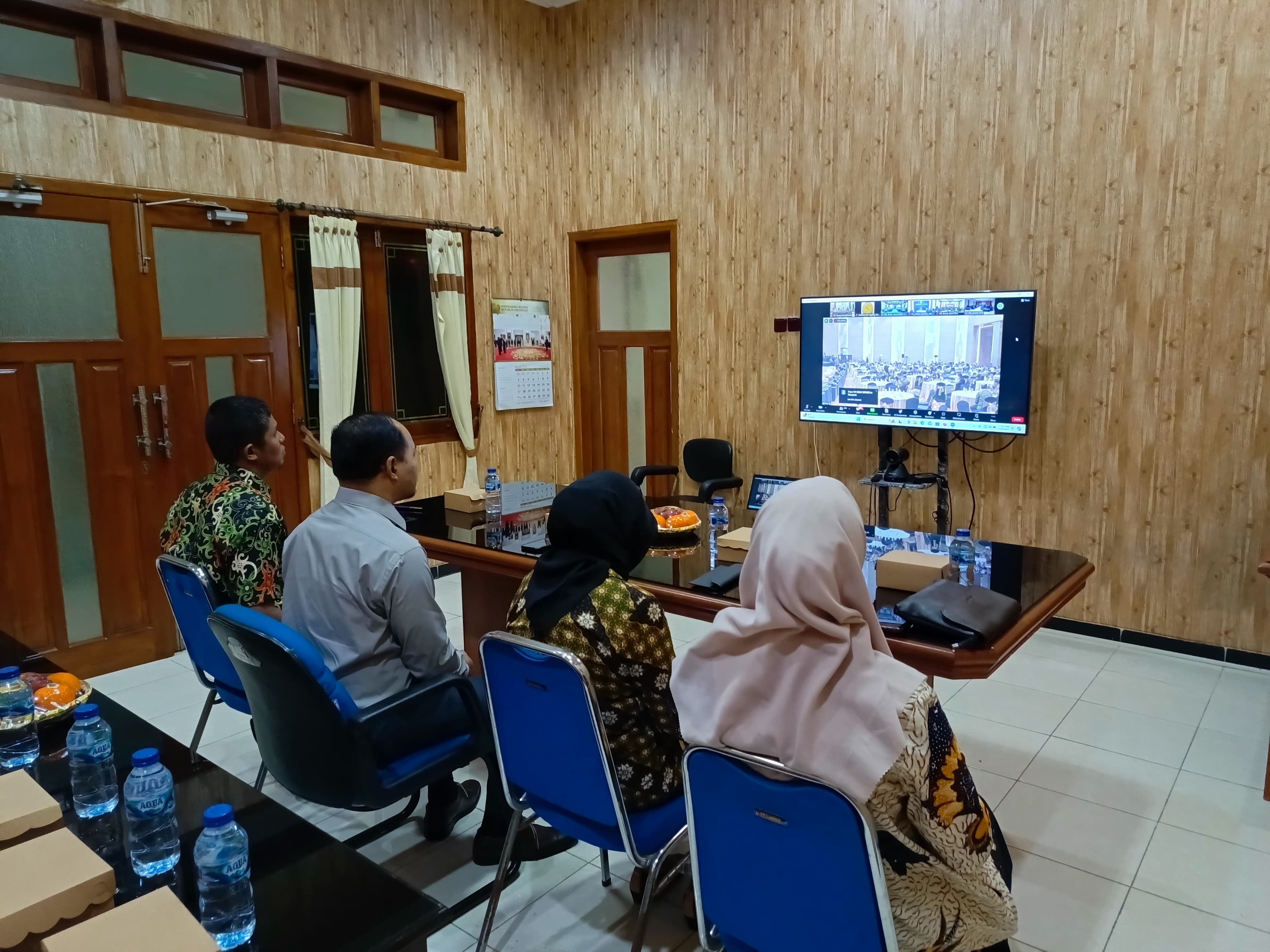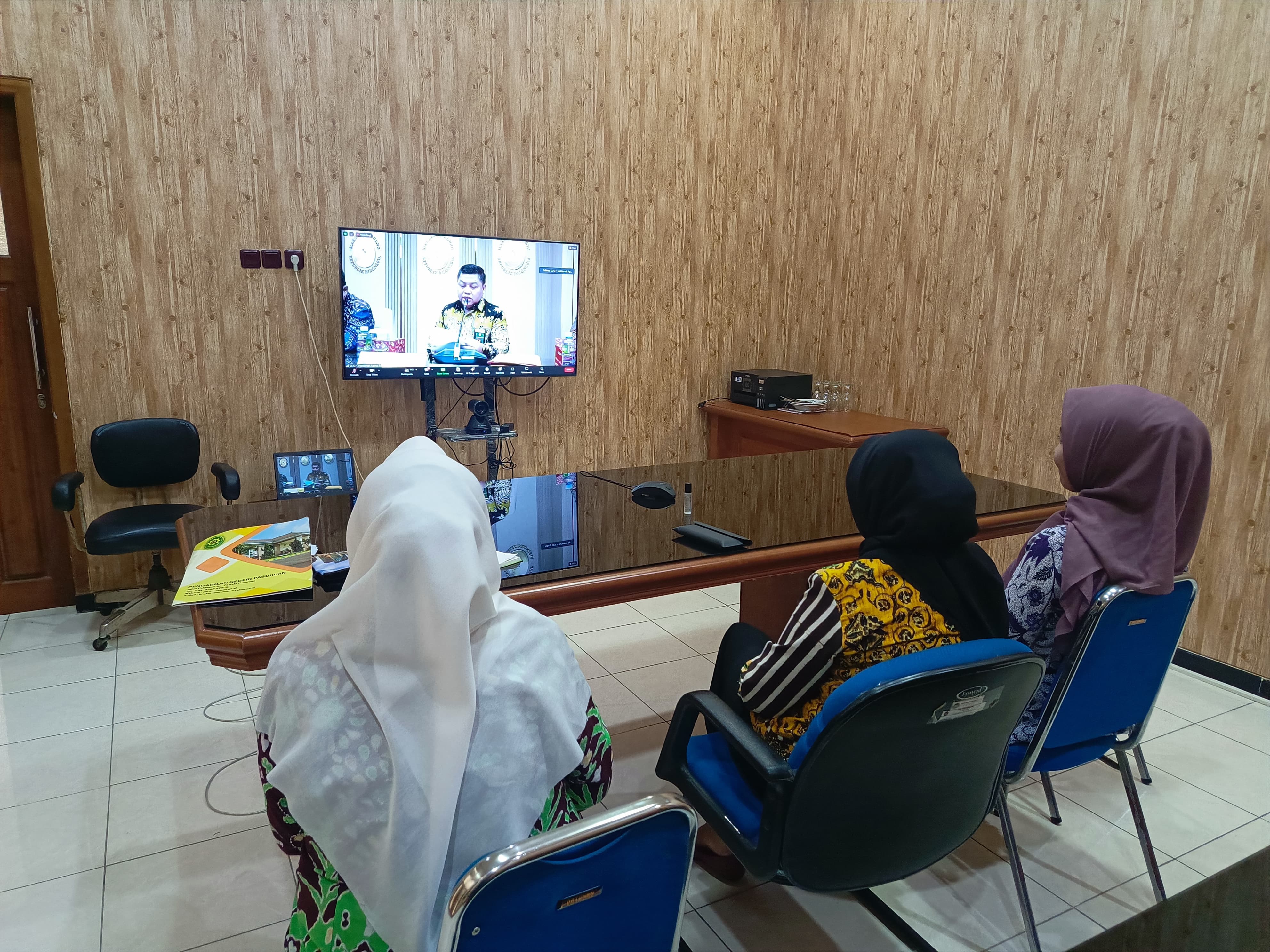 Ketua Pengadilan Negeri Pasuruan, Bapak Tri Margono, S.H.,Panitera, Sekretaris serta Para Panitera Muda dan Petugas Posbakum Pengadilan Negeri Pasuruan mengikuti Sosialisasi Layanan Hukum dan UMK Cerdas-Kum secara daring melalui Zoom Meeting mulai pukul 13.00 WIB bertempat di Ruang Media Center Pengadilan Negeri Pasuruan.